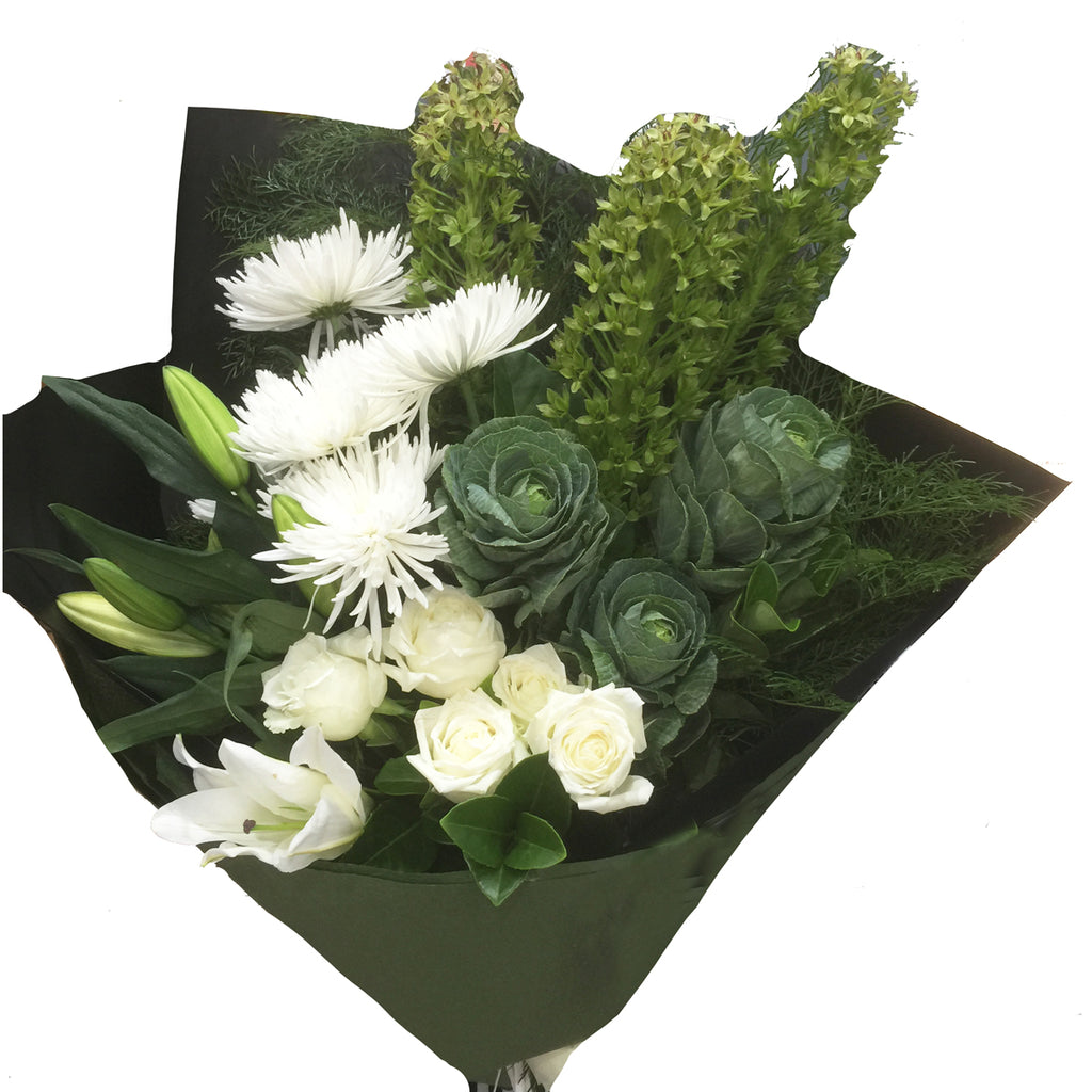 This is part of our new "Modern" range and features a beautiful range of fresh flowers and natural colours. It includes: White Roses, Disbud Chrysanthemums, Oriental Lilies, Pineapple Lilies and Kale (subject to season), and Seasonal foliage.